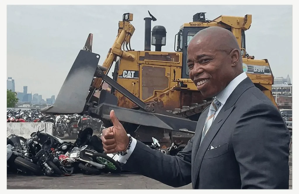Presumiblemente, el objetivo de estos actos es demostrar el control del Estado sobre los infractores de la ley y disuadir a cualquiera que produzca o consuma productos ilegales. Pero también es un intento de contrarrestar y ocultar la impotencia fundamental de las fuerzas del orden para «ganar» en la lucha contra los productos no regulados, haciendo que los mercados clandestinos parezcan concretos y conquistables mediante su aplastamiento. En estas guerras difíciles de manejar, la ilusión de «victoria» que representa la destrucción física difunde una contranarrativa desesperada frente a la realidad de la derrota. Una pila de productos confiscados sustituye a las difusas redes de comercio informal y a las comunidades a menudo marginadas que participan en ellas. Al aplastar bolsos pirata, Sotomayor intenta aplastar los mercados pirata de Nueva York, lo que eliminaría el sustento de los vendedores ambulantes, en su mayoría migrantes, y sumiría sus vidas en una mayor precariedad. Sin embargo, dado que los mercados en sí mismos persisten inevitablemente, el aplastamiento sirve más como una demostración de fuerza para ganarse el reconocimiento de la élite, decidida a perseguir a los vendedores ambulantes, que para erradicar los mercados callejeros. Cuando Adams destruye las bicicletas confiscadas, está destruyendo simbólicamente a aquellos neoyorquinos, en su mayoría jóvenes racializados, que desafían los usos regulados por el Estado de las motos y bicicletas: como forma de ejercicio u ocio limitado a los carriles bici de la ciudad, y como medio de transporte para ir al trabajo, como en el peligroso y mal remunerado trabajo de los repartidores en bicicleta de la ciudad. Las motocicletas ilegales que atraen la ira del alcalde se utilizan, en cambio, para hacer alarde de destreza atlética, audacia y maniobras similares a bailes que interfieren con las funciones orientadas a la productividad de la moto y la bicicleta en el paisaje urbano. «Hoy serán aplastadas para que nunca más puedan aterrorizar nuestra ciudad», proclamó Adams en una de sus últimas destrucciones. Sin embargo, atacar los instrumentos de estos conductores no servirá para disuadir el impulso que hay detrás de los usos subversivos de las motos y bicicletas: una forma de expresión y autoafirmación desafiante que arrebata las calles a los coches y camiones y detiene momentáneamente el transporte de bienes y servicios.