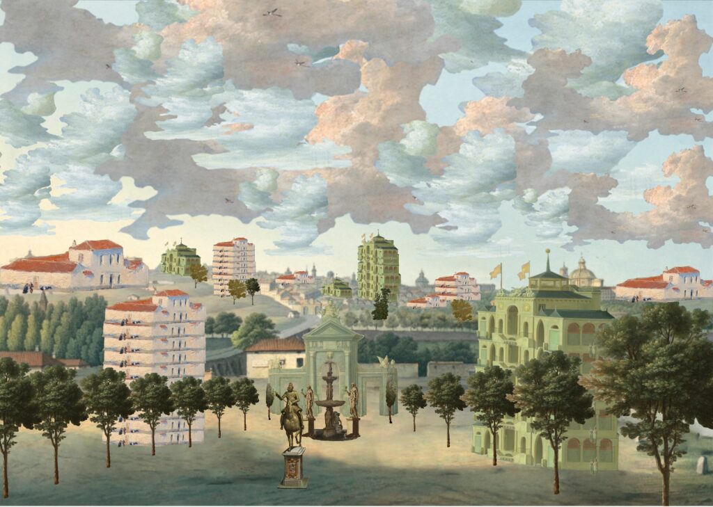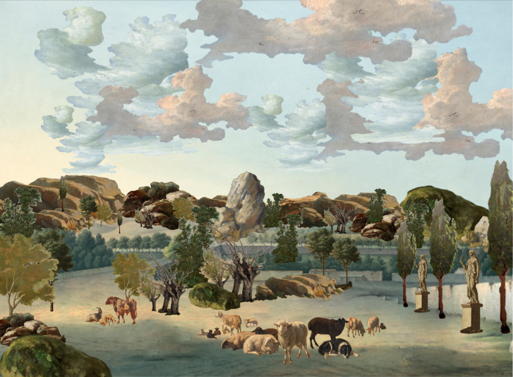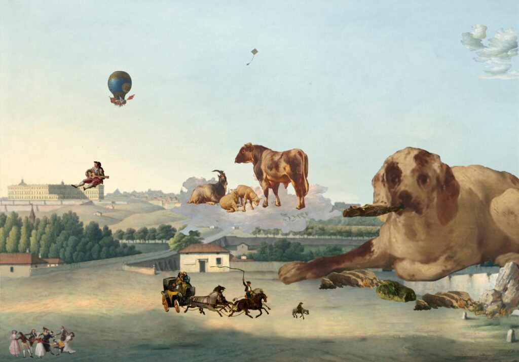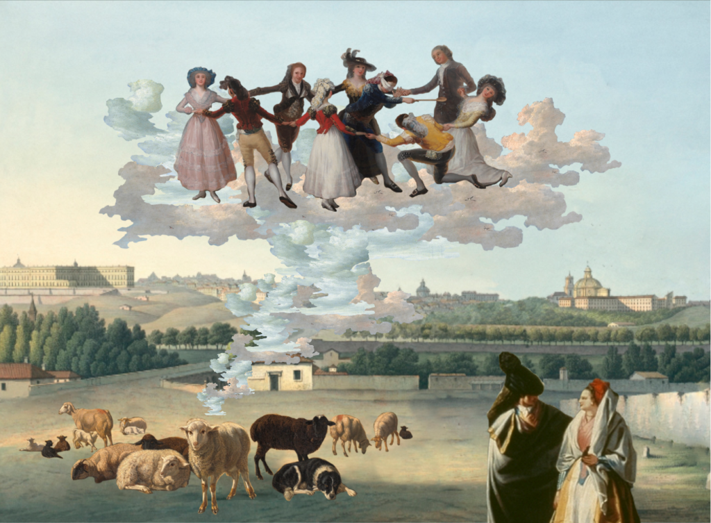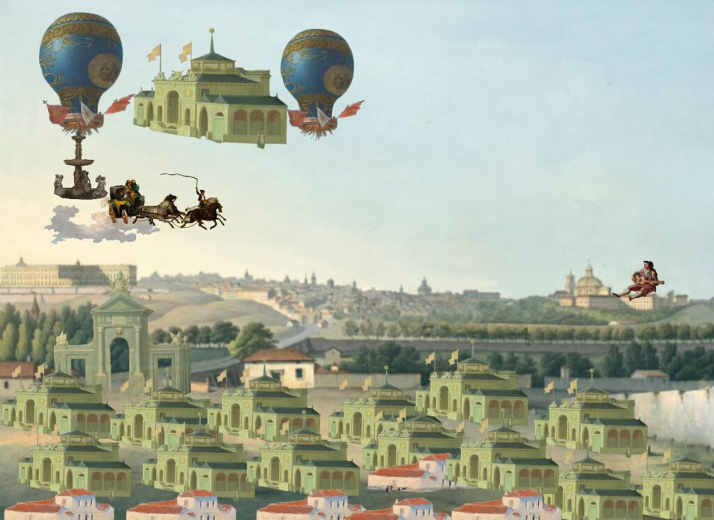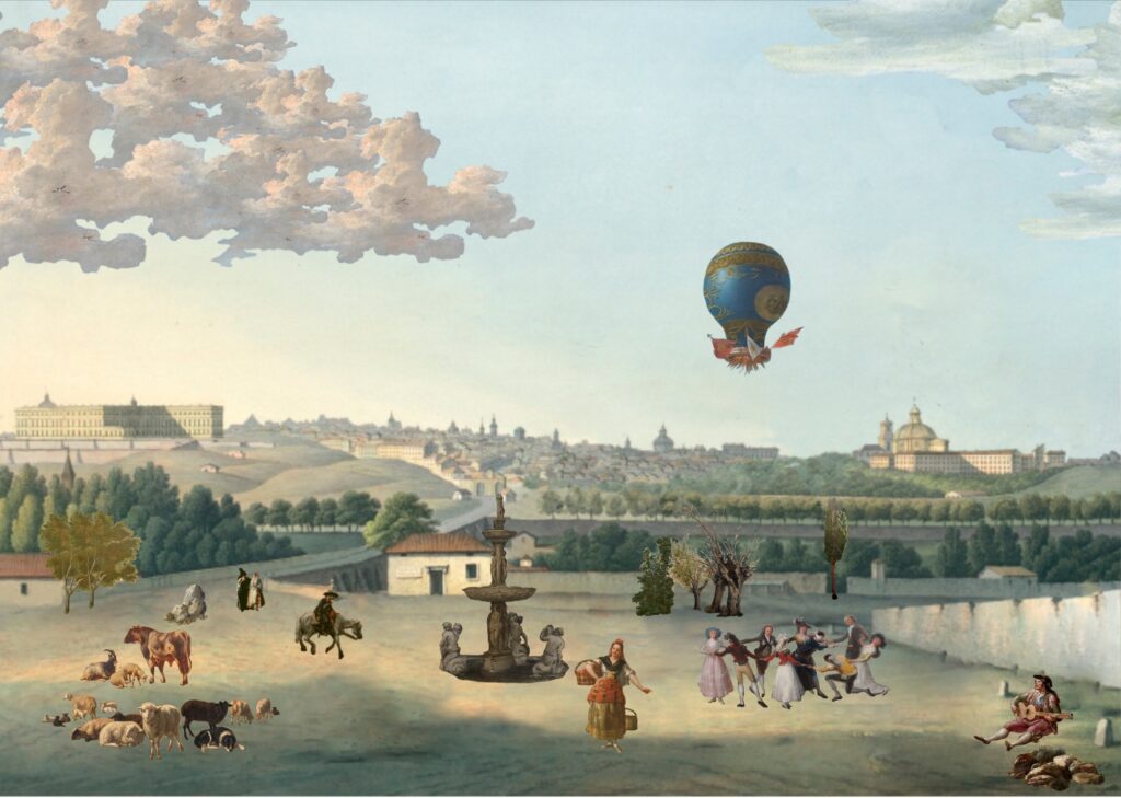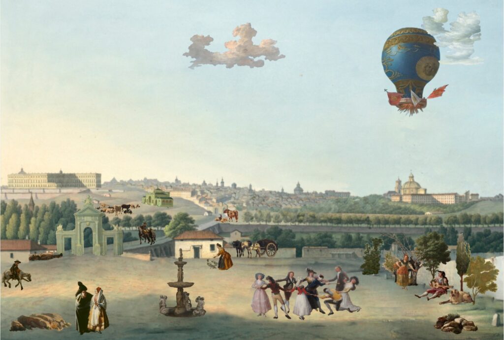 Los elementos clicables han sido extraídos de pinturas que retratan el extrarradio madrileño de los últimos tres siglos, entre otros, de autores como Aureliano de Beruete, Francisco de Goya, Carlos de Haes, Ramón Bayeu, José Ribelles, Luis Paret, José del Castillo, etc.